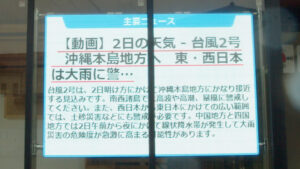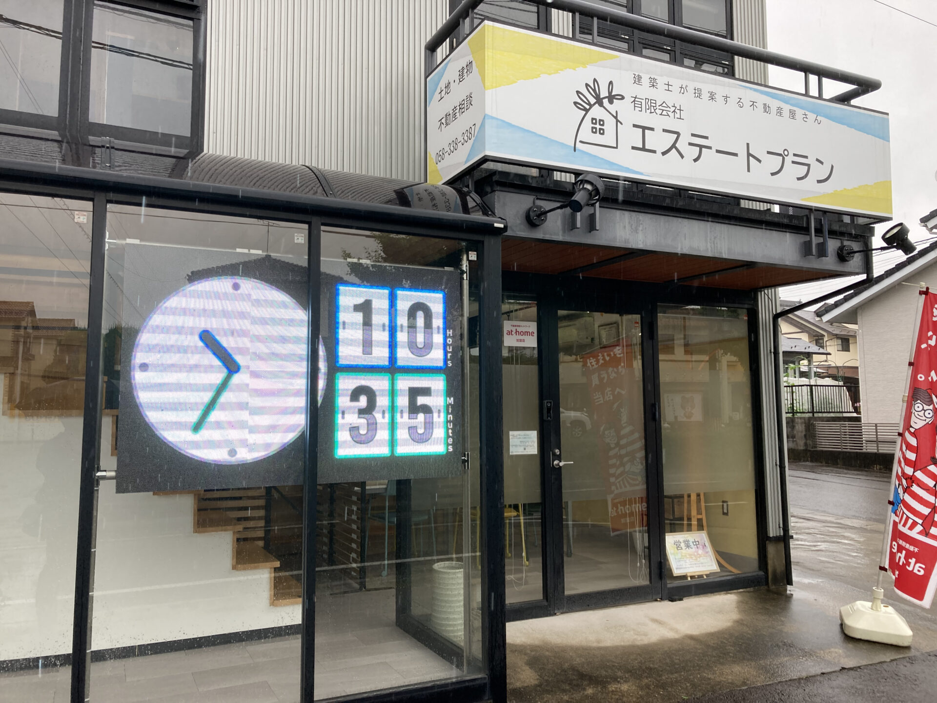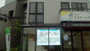 前を通る歩行者と車に対して 不動産+NEWSや地域情報 デジタル時計を表示